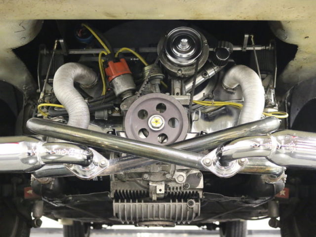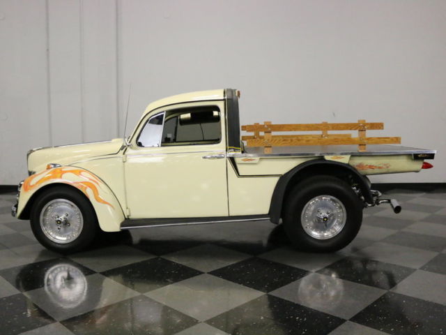 Mixing styling elements from a vintage Ford on a classic Volkswagen foundation would seem to be a difficult endeavor with a very delicate balance. Choose the wrong components or merge exterior parts that are too dissimilar and you could end up with a four-wheeled Frankenstein monster. So, with the bar of difficulty set so high, it's especially impressive that this 1968 VW Beetle has emerged from such an endeavor as a unique but well-executed and undeniably fun to drive custom car. Clad in a shade of Cadillac tan that's adorned with flames on its front fenders and pinstripes on its flanks, it only takes a single glance to see that this is no ordinary Beetle. The hood mimicking a 1940 Ford, with its elaborate chrome grill and prominent trim still in tow, extends outward from the easily recognizable form of VW's most popular offering, while in back, a full-blown flatbed sits in place of what would otherwise be the back half of the car, sporting a pair of tail lights from a 1959 Cadillac. It's not something you see every day, for sure, and yet it works. Very well. Its assembly was obviously performed with a strong eye for proportion and finish, as these seemingly disparate parts actually fit together well to make for an unabashedly unique car that will no doubt receive thumbs up from onlookers wherever you may roam. Yet as ambitious as it is, it's well-finished and properly aligned, as well, as both that vintage transplanted hood and the still-stock doors open and close securely. Just inside those doors, the tan interior strikes a nice balance - custom styling set against a vintage, stock backdrop. There are plenty of distinct touches, such as the silver frames at the tops of the doors and a one of a kind steering wheel, but they reside in an inviting and still-familiar VW environment. The pair of comfortable, high-backed cloth bucket seats that sit in place of their original German counterparts are still in good shape and blend in well with their surroundings. The dash area retains its stock-looking configuration for the most part, with a set of VDO gauges taking their place just to the side of the original single dial cluster, which is still very readable behind a clear lens. Just underneath the glove box, a Sony AM/FM/CD player sits ready to provide the audio options you're looking for during your journeys. Up front in the storage area, a full-sized spare is securely stowed, while in back, the custom flatbed is in great shape - unscathed and framed with stainless steel, and flanked by hardwood retaining walls to each side. This unique vehicle is as fun to drive as it is to look at. A 1766 cc VW engine sits underneath the bed in back. Carrying a pair of Weber carbs and a 1:23 Eagle cam, it's in great form - starting right up and running smoothly as it exhales out of its Porsche exhaust. It's bolted to a 4-speed manual transmission that shifts with confidence-inspiring precision to provide a thoroughly enjoyable driving experience. As an additional measure of protection from the elements, the bottom of the car has been treated with a coat of rust inhibitor. This truly unique vehicle sits on a set of 15" custom wheels, with Kumho tires up front and Goodyear Wranglers in back. Looking for a one of a kind vehicle that's a blast to drive and will stand out in a crowd? You have to check out this 1968 VW Beetle. Call today!