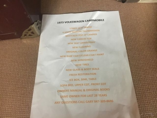 This 1973 Volkswagen Campmobile with a Westfalia Pop-up camper. Previously owned by the same owner for the past 28 years. The beautiful exterior color is Brilliant Orange. Items replaced during restoration include: New canvas top New seat upholstery New flooring New base/clear coat paint New windshield New tires New glass and body seals Customer folio Owner's manual Stunning Van that runs, shifts, and drives great. Give us a call today to set up an appointment to see it. Call Steel Affairs team at 303-656-6534