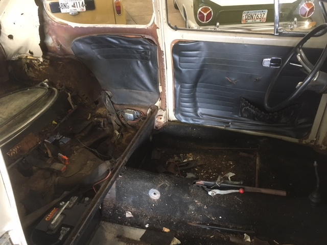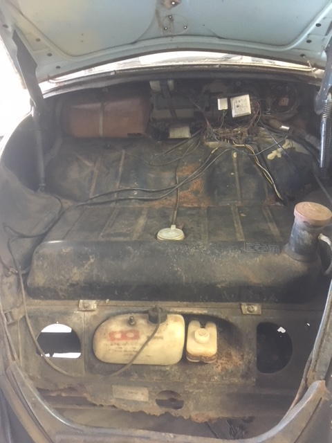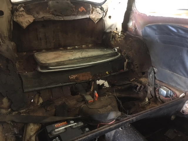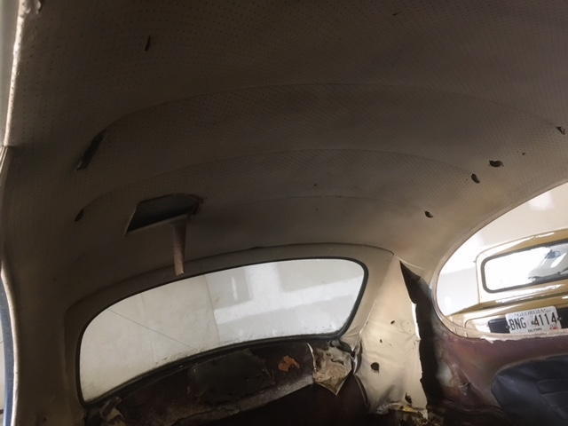 As you can see, it has no seats and there are rust holes in the floors. It has a set of opening quarter windows, which are lying inside the car where the back seat would be. They appear to be in good condition.