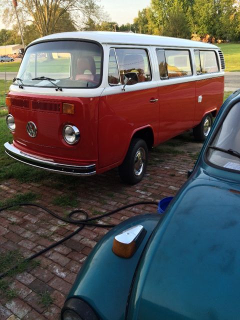 Odometer reads 103578 miles, but completely restored 4 months ago. I have 11,000 in parts and materials. Engine rebuild, new starter, alternator, gas tank, etc. new interior headliner, seat covers, door panels, cushions, etc. fresh ppg paint. This van came from Louisiana and passed inspection in 93. All body panels are original. Comes with new ac/dc refrigerator that can be powered by plugging 110 extension cord into flip up on side of van that also powers a gfci outlet inside van, or for dc I've added extra battery and solar panel making off grid camping possible. The table adjusts down into a bed with storage under seats. Options from factory include power brakes and front disk brakes. Original engine and 1974 only year some came with all aluminum Porsche 1800cc engine. Must see and drive too appreciate. If near southern Illinois and looking for a Vw ready for show, street or camping, this one is worth a look. Thanks
