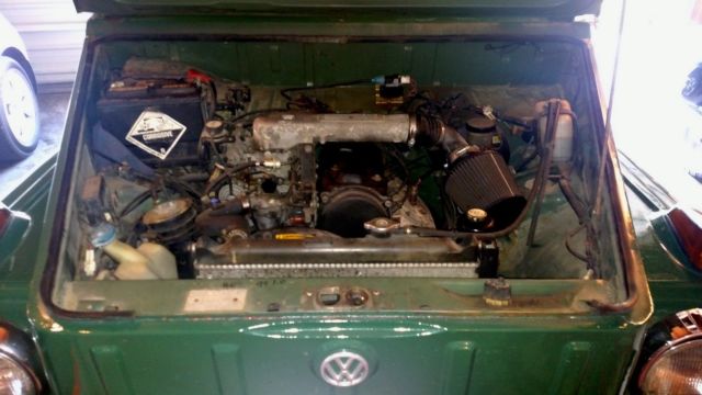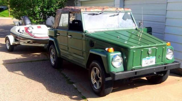 THIS IS A SPECIAL ONE! 1974 VW Thing, Type 181 with special modifications NO RESERVE! The VIN number IS CORRECT & straight off the title! This is a wonderful car and I hate selling it, but I’m getting married and moving 1200 miles. The long and short of it is that I can’t take it with me and I need the money for expenses, so here goes… This is a DRIVER! Let me explain what this car (my retirement project) is all about. The restoration was done on top of a ‘94 Geo Tracker (frame lines up precisely with the body…who knew?) so it has the 1.6L tracker motor in front while the original engine compartment is now a trunk. The tracker had 10,000 miles on it when the restoration began. It was in a roll-over as a Tracker, but the frame is perfectly straight with no damage. Current odometer is 55k and change. You can drive this car all day at 65 mph and never worry about burning it up. The motor runs beautifully, especially since a recent tune-up a few weeks ago, NEVER overheats, absolutely reliable start even in Iowa’s 20-below winters. You can expect 20 mpg around town and 23-27 mpg on the highway depending upon how fast you drive. Brand new belts too. New muffler system 2 years ago. Comes with a waterproof cover as well. Also four extra wheels. It has the Tracker interior, which is nice. But that also means no back seats (see pix), just driver & passenger with storage in back. It also has the Tracker 4-wheel drive, which is super useful in the winter. Five speed shift plus reverse of course. All new tires put on a year & a half ago, maybe six thousand miles on ‘em, they look and drive like new. As you can see in the pix, I have the ORIGINAL hard top. Those are as scarce as hen’s teeth and it’s in excellent shape. I bought a new, heavy-duty powder coated convertible frame from the Thing Shop and had a custom camouflage vinyl top made. The rear window has been double-sewed in, so it’s not coming loose any time soon. I mounted the spare tire holder on the back, which has a never-used brand-new tire on it plus a matching camouflage tire cover. I also installed nice windows from the Thing Shop (can you say $$$?). The driver window has sliding glass, the passenger window a vinyl wing that opens and snaps to the outside. Fresh paint last spring, and it looks great! A couple small bubbles here and there, but I have those repaired and repainted each year. I spent years cutting out rust, bondo and endless sanding, replacing parts (like the rocker panels - one from California and one from Denmark), new metal welded in on the sides and whatever else was needed. This car is SOLID and good to go. I’ve been religious about maintenance and oil changes, and whether you believe in the product or not, I use Startron Gas Enzyme at every fill up (which I use in all my motors) and the engine just purrs. This is not really a “show car”, but then again, I’m not asking for the kind of money those cars go for. It is a good-looking, solid, dependable and just plain FUN car. Take off the doors. Fold down the windshield at the drive-in. Take the top down. Whatever. Oh, and it has the towing package but the boat doesn’t come with it. The radio is toast. If you’re serious, there’s a $500 non-refundable deposit due within 48 hours of the auction end. You can come out and drive it home, you’re welcome to stay overnight here at the house if you like. Plus, like any older car, it has little quirks I’d want to bring you up to speed on, none of which are deal breakers. Just personality markers. You’ll love this car as much as I do. You won’t be able to help yourself. Questions? Give me a shout at 563-424-0622 I had been requested to post pix of the chassis, but found it impossible to get decent photos. The chassis is in great shape. Solid. BTW, if it doesn't sell this week, the price is going UP when I re-list it, and will continue to do so each time I re-list it. This is the best starting price I can list it at, so if you're interested, you may want to act on it.