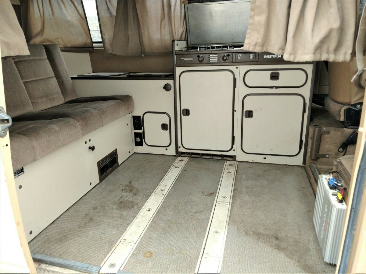 1985 Volkswagen Bus/Vanagon Westfalia . Condition is "Used". Runs and drives but may need a bit of TLC. All the glass is in great condition with no leaks. No rips or tears on all upholstery .The camper top needs new canvas. Needs new carpet, vizors, 1 door handle, windshield wipers, rear bumper, rear shock tower, decals. All the gauges work. Kenwood sound system. Body could use repairs to make it perfect. Rear cabinet had previously been cut out. I have the curtains. Possible delivery available. A Colorado Vehicle. Call for info 719-439-4089.