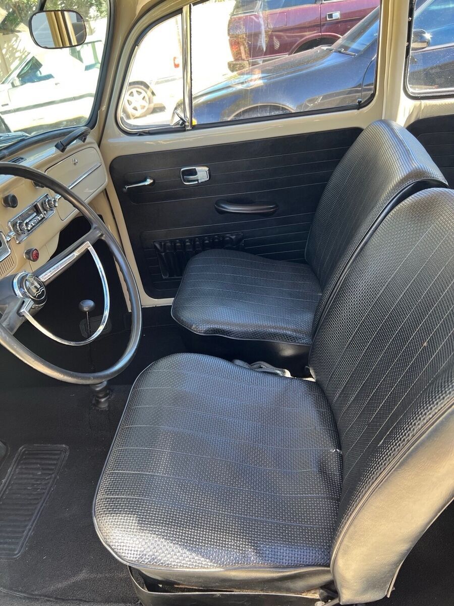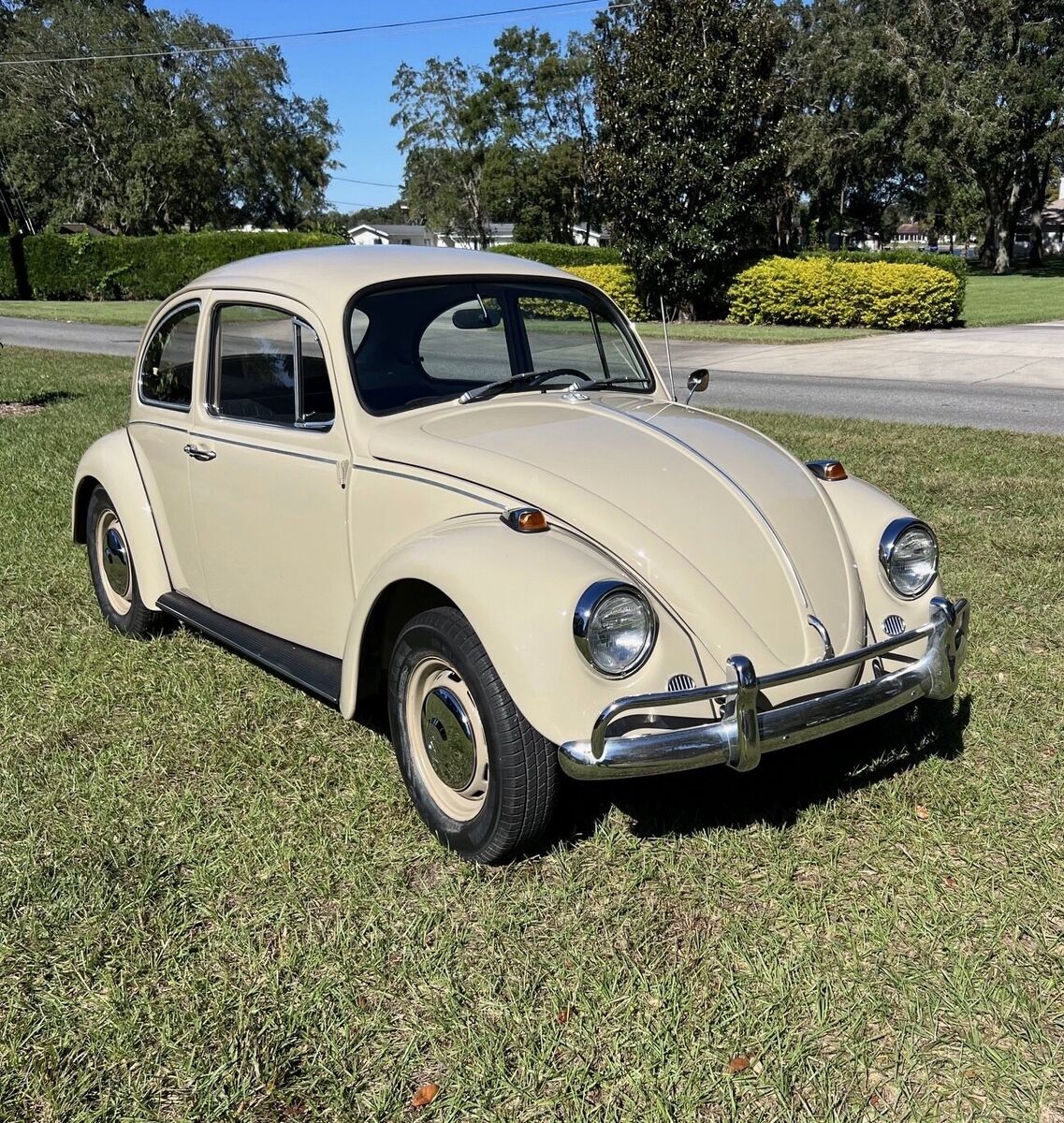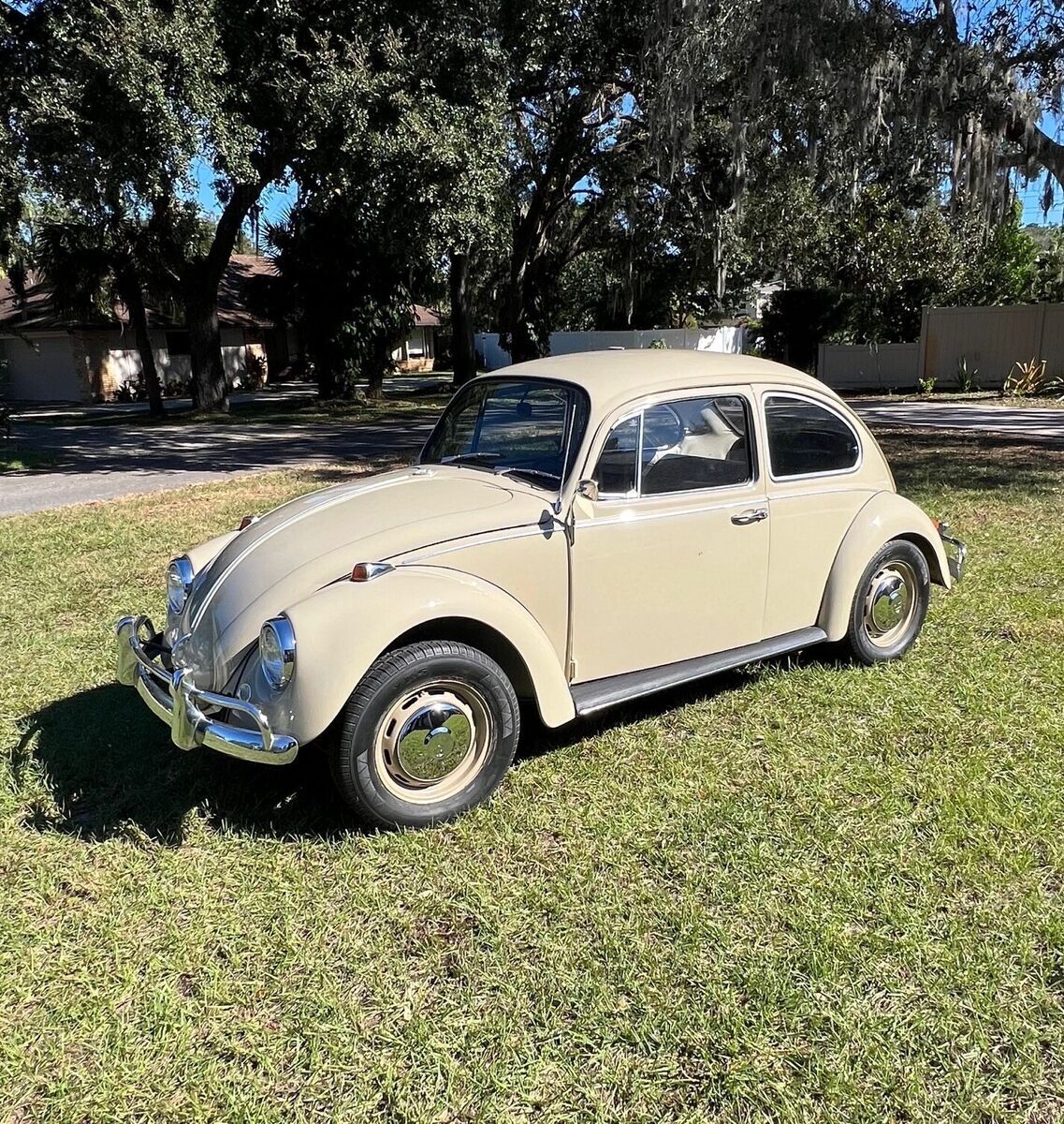 The refurbishment included: the body was stripped, rust repairs were performed, the window seals were replaced, and the car was repainted in beige, according to the seller. Details include polished beltline trim, a left-side mirror, pop-out rear quarter windows, dual “pea shooter” exhaust outlets, and chrome bumpers with overriders. The seller notes the windshield washer fluid sprayer does not work and rust is evident on the bumpers and inside the trunk compartment. Body-color 15″ steel wheels wear polished hubcaps and are mounted with 165-series Nexen SB-802 tires that are in need of replacement. The seller notes that the wheel cylinders and shoes were replaced. The front bucket seats and rear bench are upholstered in black vinyl and are joined by a replacement headliner, carpets, and door seals. A cabin heater, a passenger grab handle, and door map pockets are further elements. The seller notes that the driver’s lower door hinge sags, the driver’s seat cushion is torn, and the radio speakers are missing. The two-spoke steering wheel features a chrome horn ring and a Wolfsburg crest center cap and frames a replacement 100-mph VDO speedometer and fuel level gauge. The five-digit odometer shows 690 miles, which is said to represent the mileage accumulated since the completion of the build. True chassis mileage is unknown. The air-cooled 1.5L flat-four features a single Solex downdraft carburetor and is said to have been overhauled as part of the refurbishment. Power is sent to the rear wheels through a four-speed manual transaxle. The fuel tank and sending unit were replaced, and rust is evident on the underside. Vehicle Details 1967 VW Beetle |