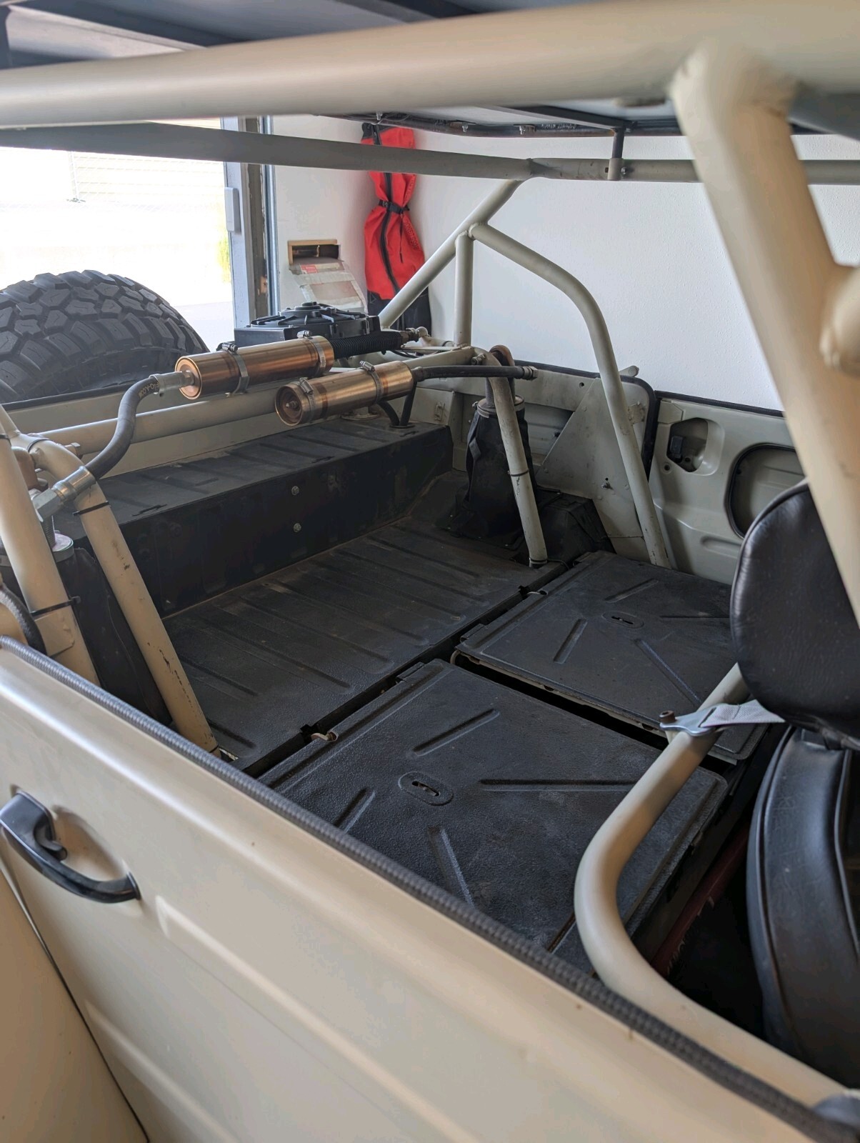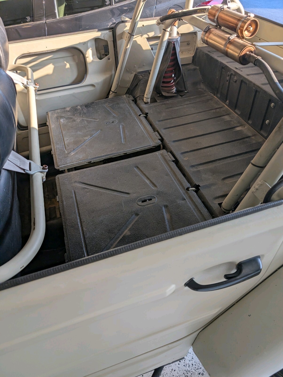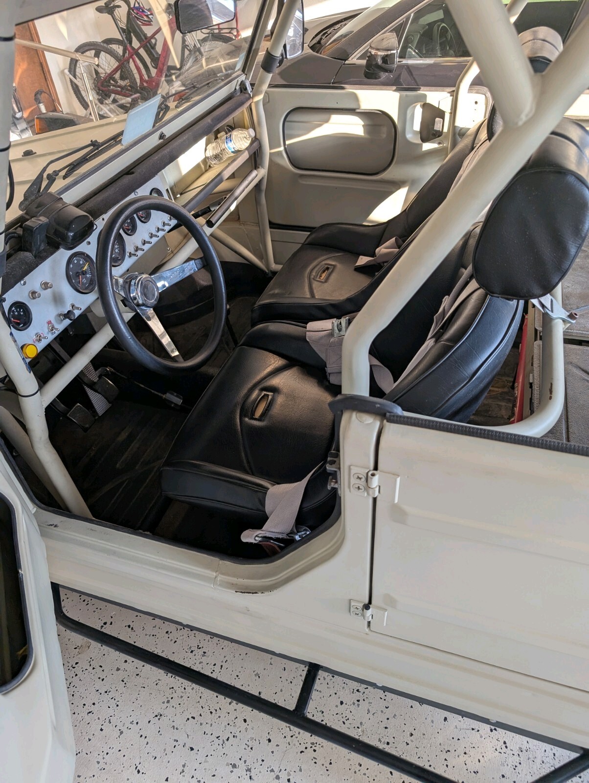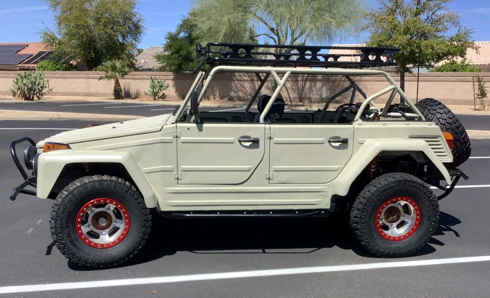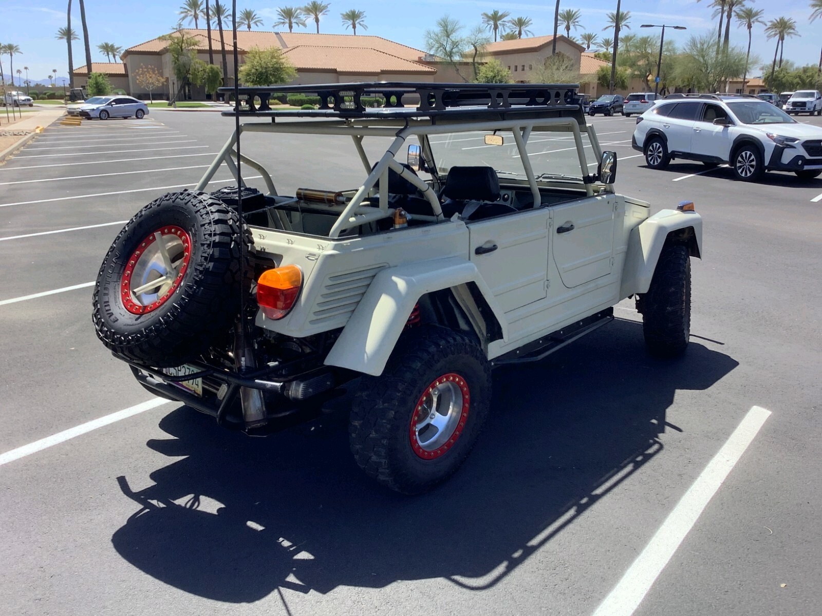 1973 Volkswagen Type 181 Thing. Fun off road car, draws lots of attention. Engine: VW case, machined full flow oil passage, cut for 94mm barrels. 74mm counter weighted crankshaft, 94mm pistons and barrels, 12# 200mm flywheel w/ cromoly gland nut, EMPI high lift cam, windage tray, high volume oil pump, special drain pan w/ extended oil pickup, CB Panchito heads, dual valve springs, cromoly push rods, 1.25 rockers, solid shafts, aluminum bolt on valve covers. Other: 4" taller and wider fiberglass fenders, full roll cage, coilovers with reservoirson all corners,off roadseats with harnesses, 091 buss trans, solid mounts, cromoly 3x3 rear trailing arms, Thing stub axles, EMPI axles and CV joints, EMPI wide 5 disc brakes, cromoly 6" wider front beam with 4" longer trailing arms, EMPI spindles with additional bracing, electric power steering, rack and pinion with 1" tie rods with hiem ends. 16 gal. Aluminum fuel tank with baffles and roll over vent, electric fuel pump, hanging pedals, hydraulic clutch, VDO tach, speedo, oil pressure, oil temp, volt meter, fuel gauge. LED 9" spot lights, 40" LED spot and flood light bar, LED headlights, 100amp battery, 6 LED amber rear dust lights. Floor and cargo area is painted with bed liner, paint is Toyota Sandstorm with flattening agent. 2" body lift, new floor pans, and custom steel top rack. Licensed in Arizona but located in Washington State right now. |