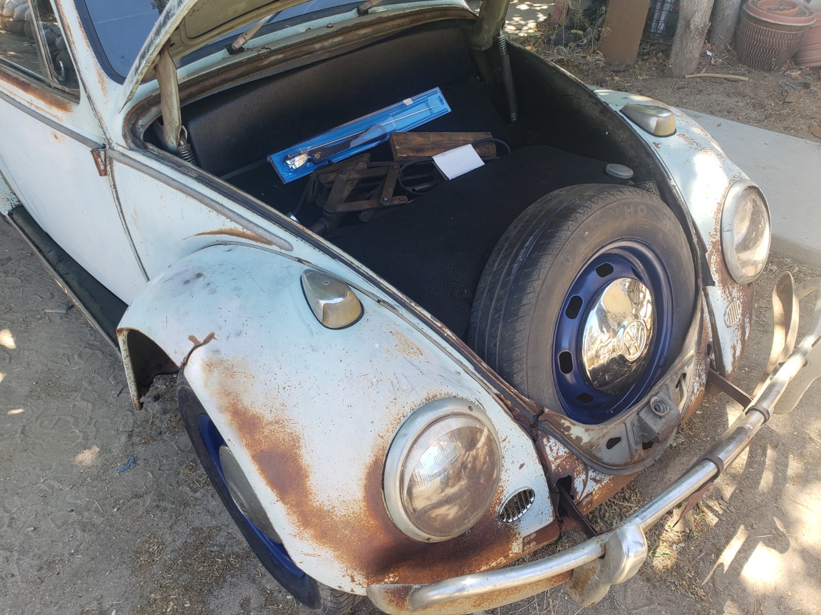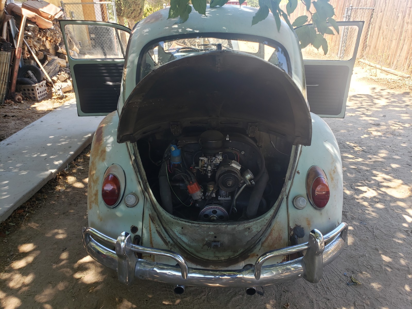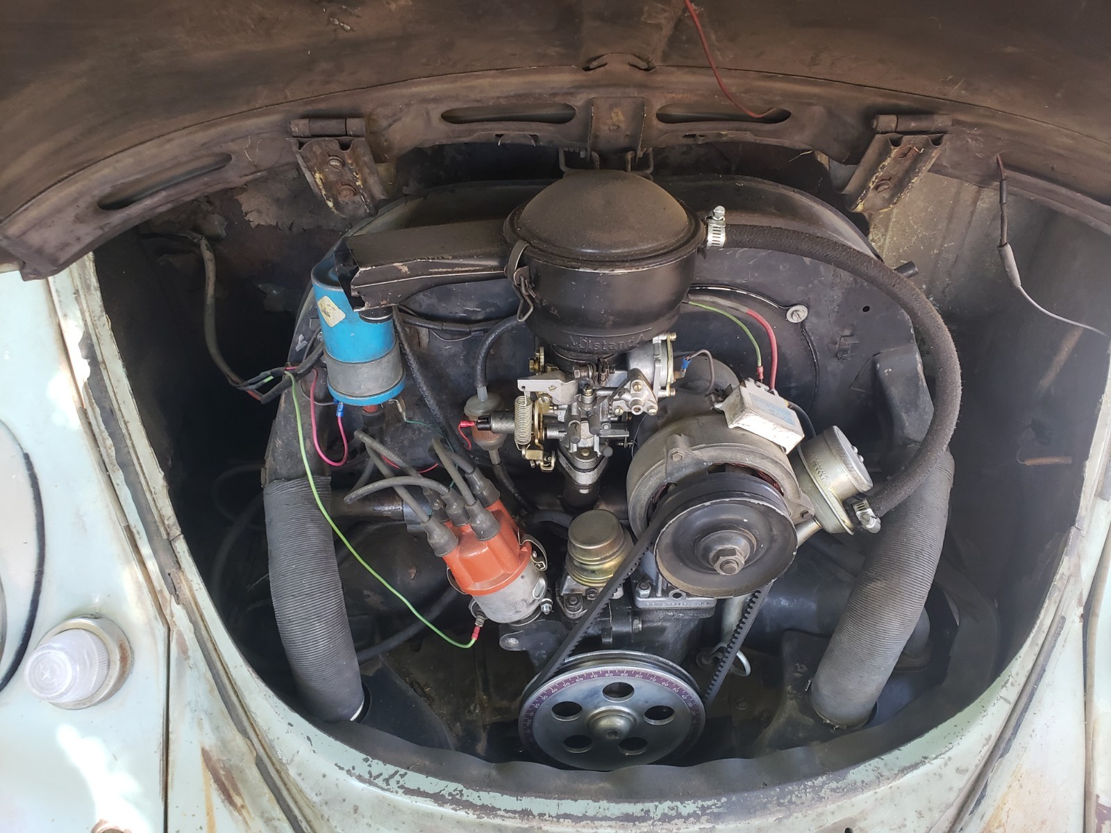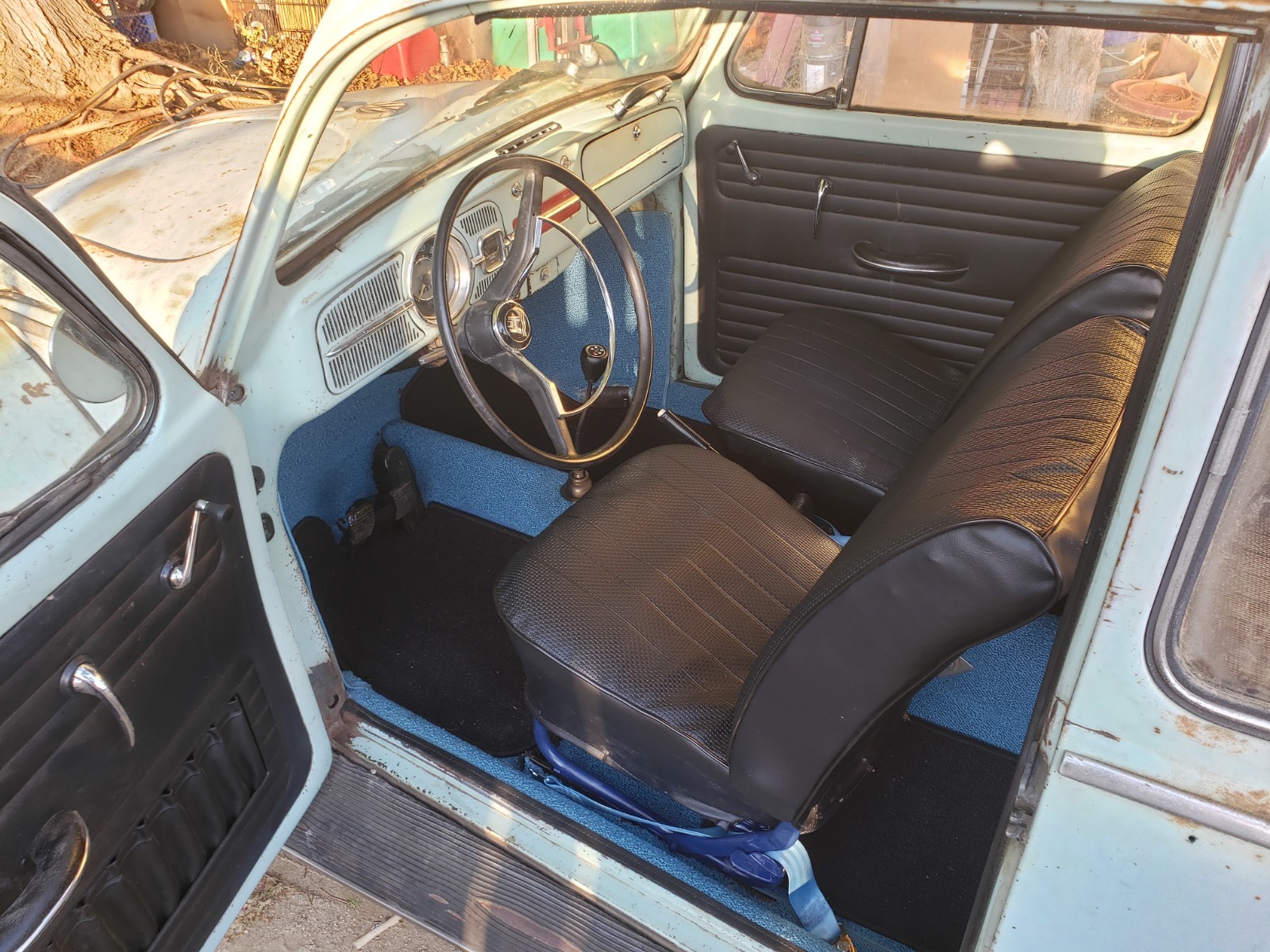 Up for sale is a 1966 VW Beetle (Bug). I purchased this car some time back, with the intention of restoring it, but have buried myself in too many projects (again), and I have to let this one go. Upon purchasing the car, I was told it had only been sitting for a short while, so I added new oil, and new fuel, and it fired right up. It has a very durable Optima "red top" battery, which easily starts the car. I noticed the "Generator Light" was on when it first started (which is great, as it shows it works), but once you rev it a little bit, it goes out, and stays out, again ... as it should. I started with the interior first, and hadn't gotten to the engine yet, but since it runs so well, there was no urgency, and I'm sure with a minor adjustment to the carburetor, or tightening of the belt, this "gen light" issue will easily be resolved. Regarding the interior, the car has new "tar boards" under the carpet, new carpeting throughout, new front seat covers and new front seat cushions. (Please note, the front driver's seat seemed a little wobbly, and I identified a small piece of metal missing at the bottom of the seat. The seat appears to work fine, but the new owner may want to address this. (I will point it out once we meet). New visors, new door panels, new seat belts, a new back seat cushion and back panel. The rear seat has a small "ripped and glued" area near the front edge. Nothing too bad, just wanted to point it out. I have a set of new rear seat covers, that I will include with the purchase, so the new owner can replace the cover, (if so desired). Rear backrest is not bolted in yet, but I have included the bolts required to do so (should be in glove box). The headliner is a little worn but nothing too distracting. The glass is all intact, but the driver's window, although easily lowers, has a hard time going back up. It seems like the gears are slipping or something, and you may need to help it a little to get it closed. I'm sure an easy fix, I just didn't get around to fixing that yet. Also, one of the "wing window latches" is missing. I have placed two new ones in the glove box, so all the new owner needs to do is drill out the rivets on the old ones and replace the new ones with screws. Regarding the exterior, the hood (trunk) area also has new carpeting, and a new electrical wiring cover, which really cleans up that area. The original jack is under the hood, along with a lug-nut breaker bar and prybar for hubcaps. The engine and engine compartment look clean (as stated before, I haven't done anything to the engine yet, except for the oil and fuel). The car comes with five (5) original wheels and hubcaps (which, I'm told are hard to come by), and all tires seem to be holding air. The car has some dings, dents, and scratches, but nothing too extensive. The worst being the front right corner, where it looks like it hit something. I do not see any damage to the chassis, just cosmetic. The hood does not close completely though with the spare tire in it, So I currently have it bungeed in place. Looks like a couple well placed welds, a few minor hammer blows, and a rope-tug on the front corner, and this thing will be close to new again ;-). It should be a super fun and somewhat easy restore, and once completed, the car will be worth twice as much. Or just drive it as is and enjoy the patina. As indicated earlier, I have not done a thorough run-through of the engine, or any of the mechanicals, just simply because I hadn't gotten that far yet. I did replace the front brakes though (new rotors, pads, and calipers), also bled the brakes, but I have only driven it a couple miles or so, and although it did fine, and likely able to make it across town, I would strongly suggest you trailer it home initially, so you can do your own thorough inspection, before taking it on any long trips. It should be noted; I am selling the car in "AS-IS" condition, without any guarantees or warrantees of any kind. Once it leaves my place, it's yours ... No Returns. Please do your due diligence, and ask as many questions as you like, and I will do my best to answer as quickly as possible. Or if you want to see it, let me know, and we will figure something out. I can't recall if all the lights work, but I think one headlight is out. Also, there is an added switch (on the dash) which operates the hazard lights and makes it easy for towing. Good gas mileage -- No smog -- Cheap and easy to maintain -- Fun to drive -- Current registration -- Title in hand I wish you all the best of luck.Thank you for your interest. P.S. (I am asking for a deposit to secure your purchase. Please submit thru the "secure payment process" Ebay offers, or thru PayPal. Once received, we can make arrangements to exchange the balance and paperwork.)