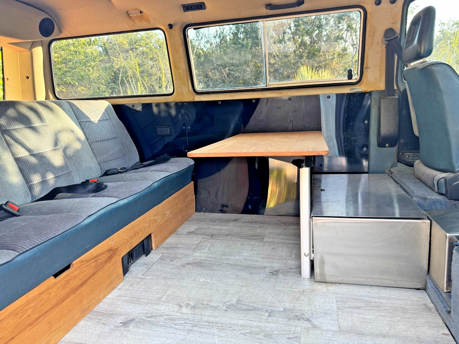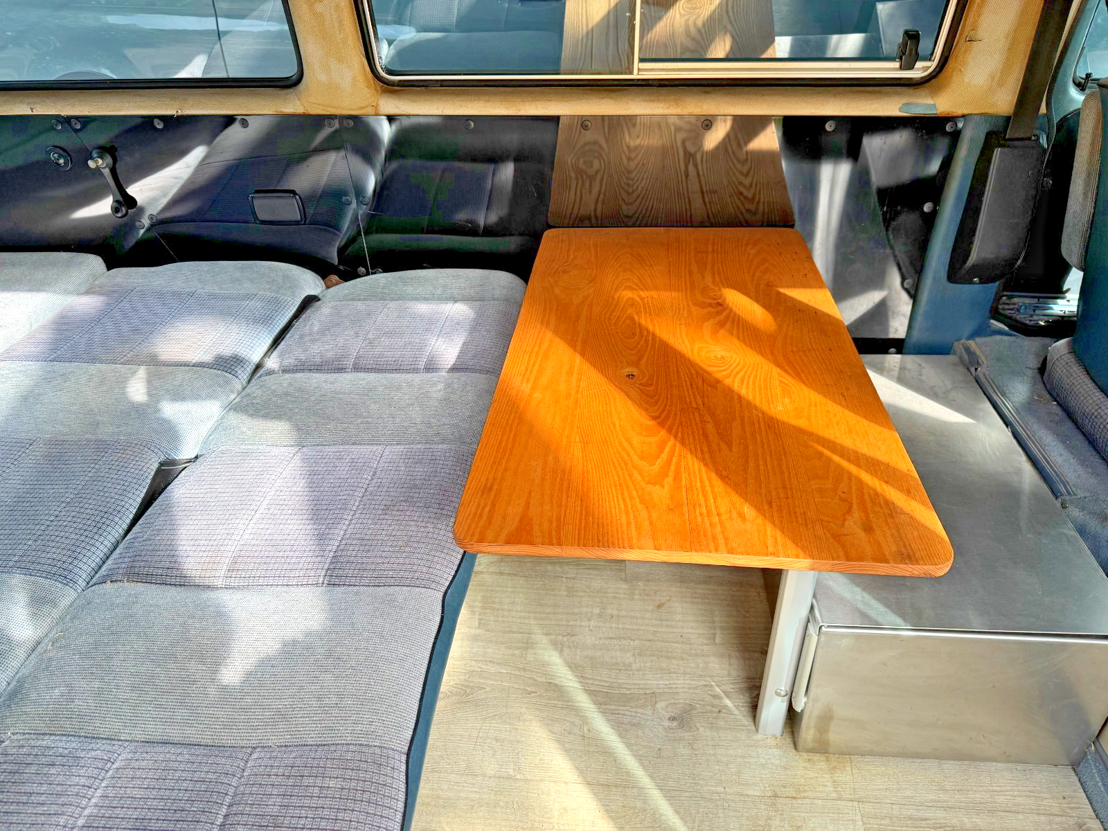 Custom stainless lockable box behind driver’s seat doubles as a seat or table base -